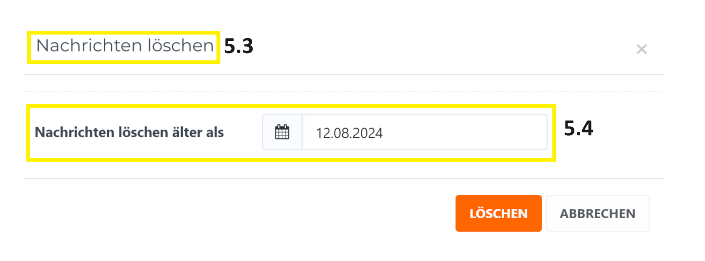 Neben dem Sprachnachrichten Speicher klicken Sie auf das Symbol (5.1) Danach öffnet sich das Nachrichten Löschen Fenster (5.3). Wählen Sie das gewünschte Datum aus, wie weit zurück die Nachrichten gelöscht werden sollen (5.4). Das vereinfacht die Löschung von mehreren Nachrichten zugleich.