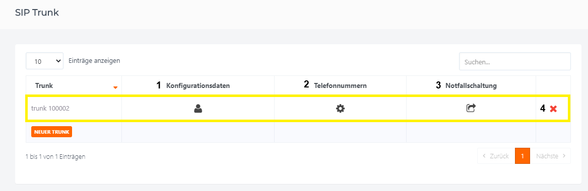 Loggen Sie sich dazu in Ihr phonestar* Konto ein. Über das Menü→ Telefonie→ SIP Trunk können Sie einen neuen SIP Trunk mittels Button NEUER TRUNK erstellen.