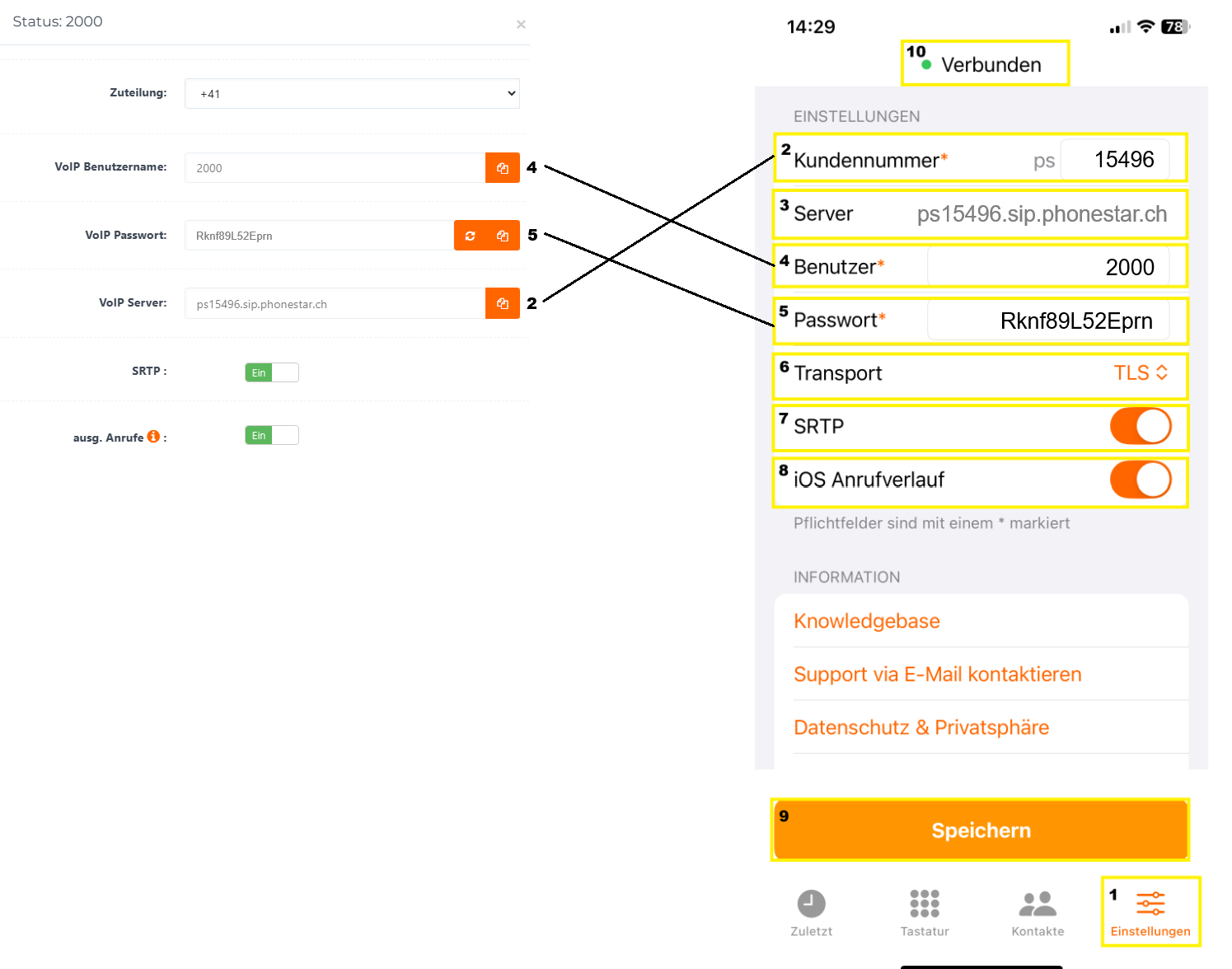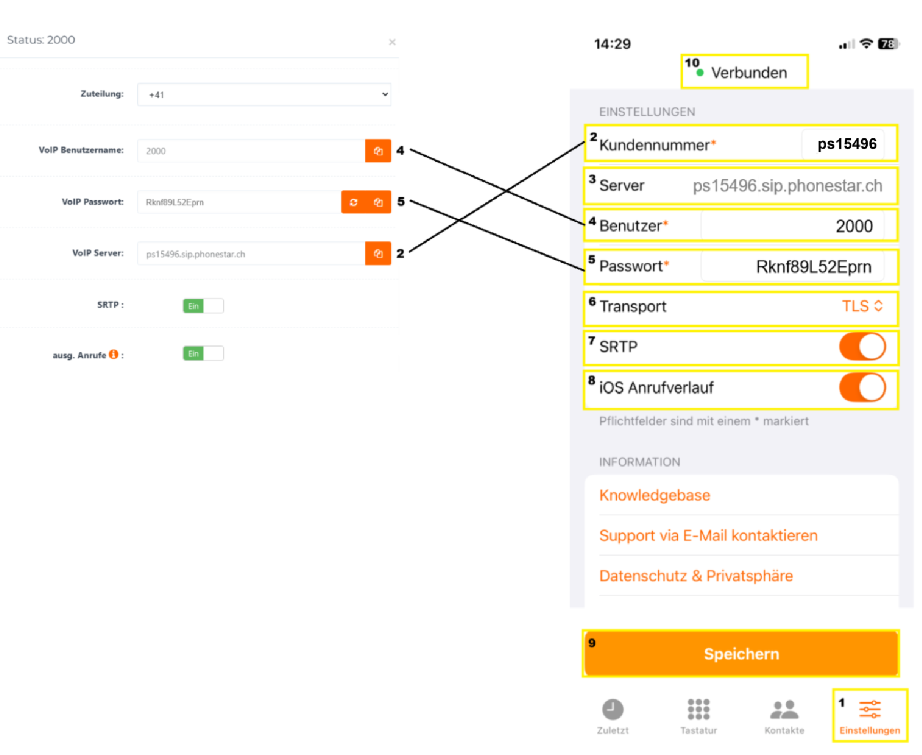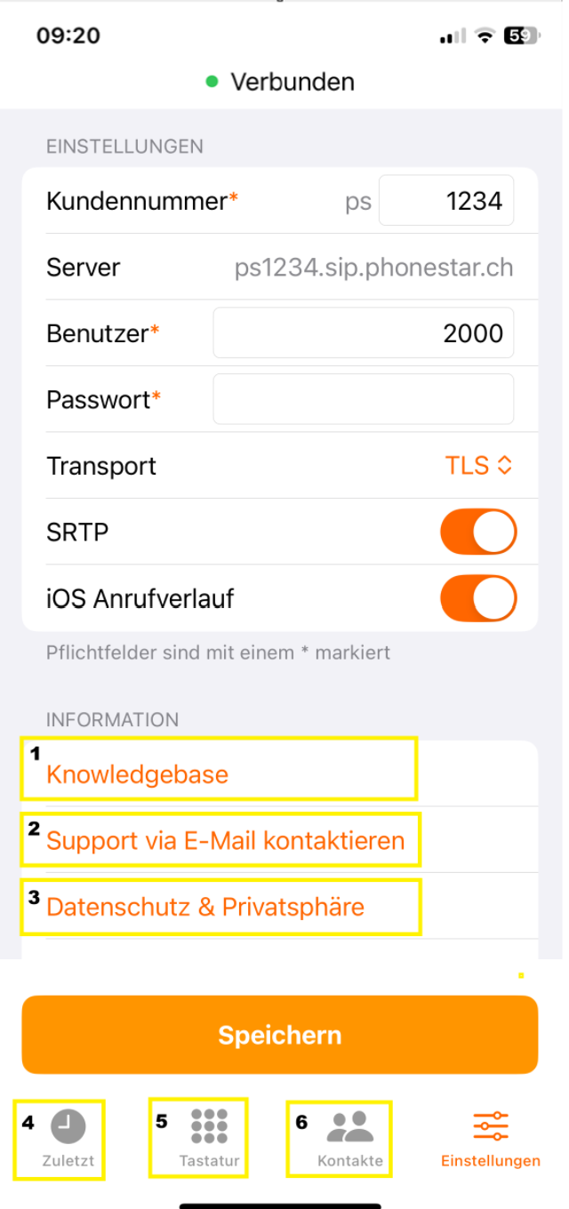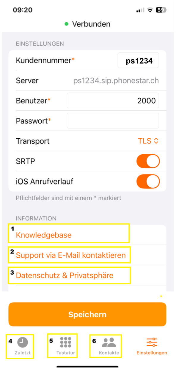 3.2 Öffnen Sie die phonestar* VoIP App und klicken Sie unten rechts den Menüpunkt Einstellungen (1). Tragen Sie nun die Konfigurationsdaten gemäss Punkt 3.1 wie folgt ein: