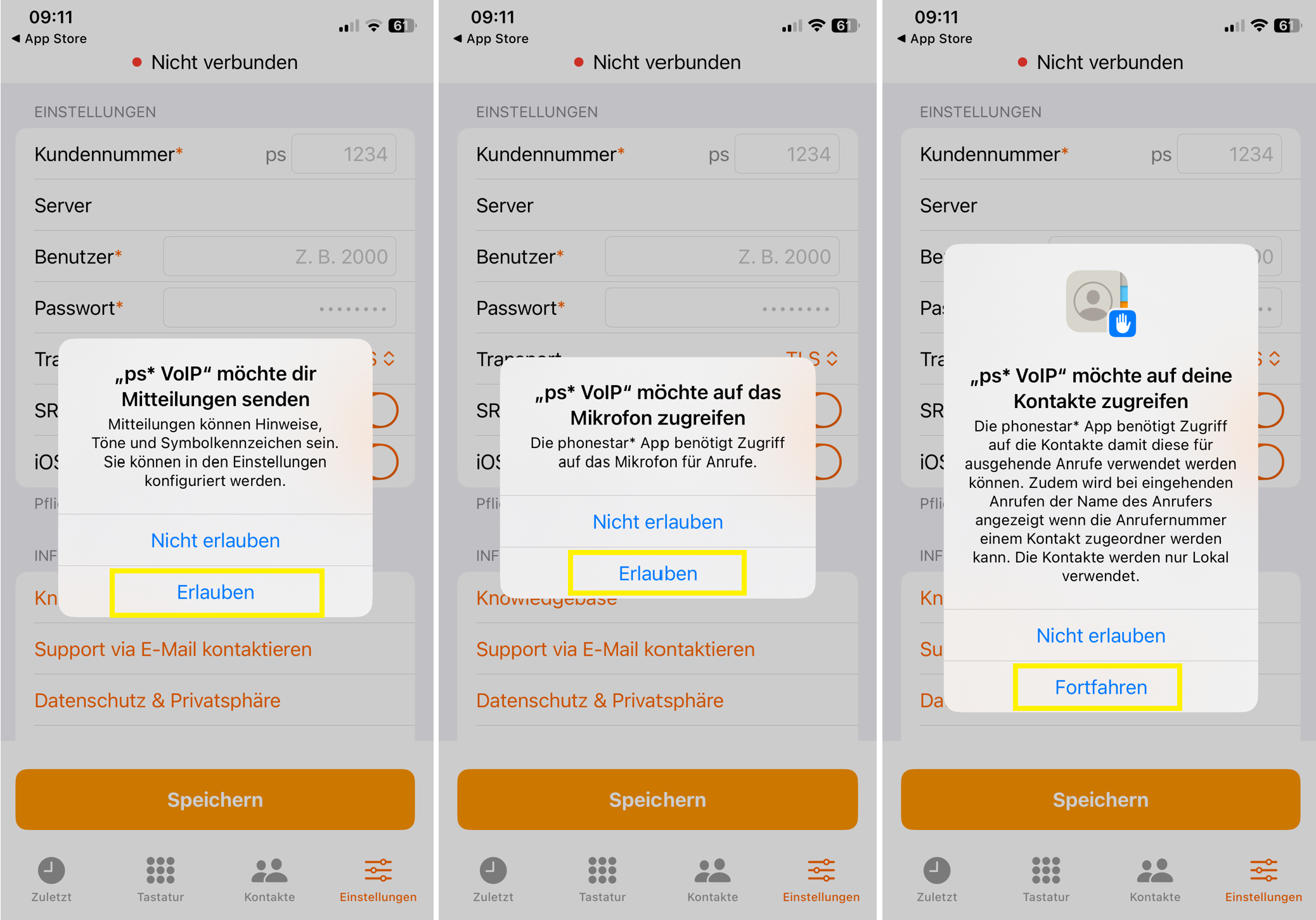 2.2 Starten Sie die phonestar* VoIP App und beantworten Sie die nachfolgenden Berechtigungsanfragen zwingend mit Erlauben, da es sonst zu Funktionsproblemen kommen kann.