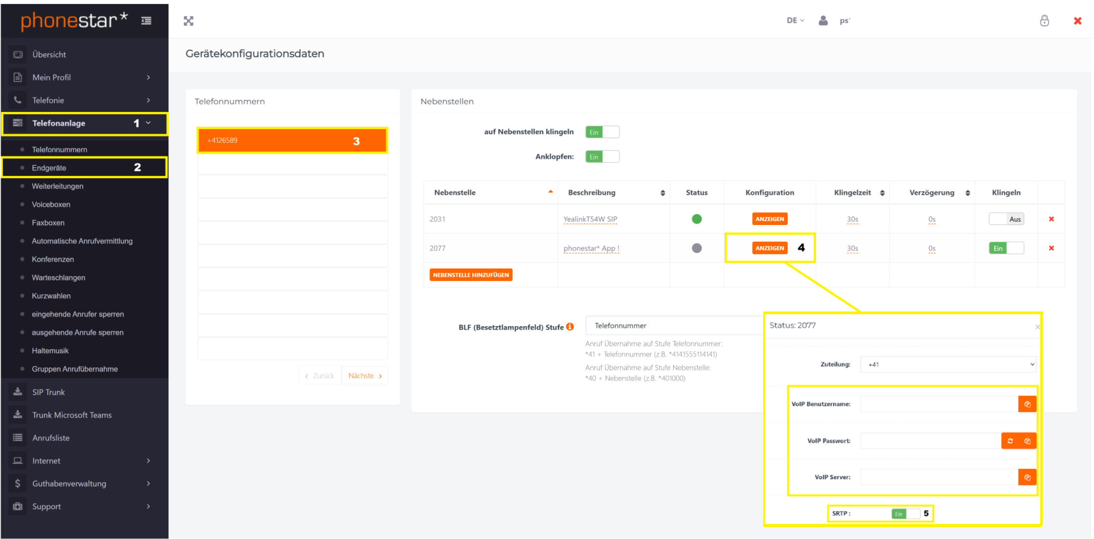 3.1 Für die Einrichtung der phonestar* VoIP App benötigen Sie die Konfigurationsdaten der entsprechenden Nebenstelle. Loggen Sie sich in Ihr phonestar* Kundenportal ein und über das Menü --> Telefonanlage (1) --> Endgeräte (2) --> Telefonnummer (3) --> Nebenstelle --> Konfiguration --> auf den Button ANZEIGEN (4) klicken und m neuen Fenster klicken Sie beim Regler SRTP (5) auf EIN um SRTP zu aktivieren (empfohlen). Lassen Sie das Fenster geöffnet, damit Sie die Konfigurationsdaten, also VoIP Benutzername, VoIP Passwort sowie VoIP Server, für das Einrichten der phonestar* VoIP App gemäss Punkte 3.2 bereit haben.