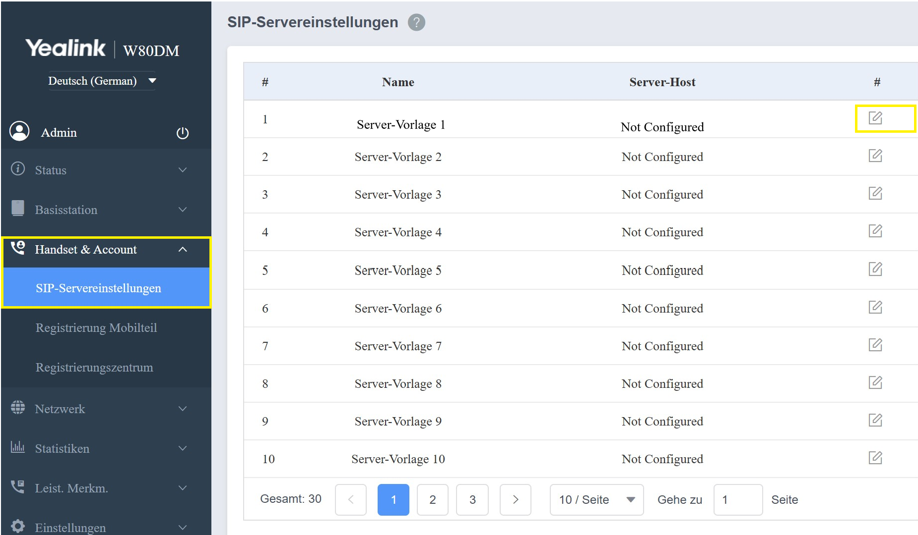 5. Gehen Sie als Erstes über das Menü zu Handset & Account und anschliessend zu den SIP-Servereinstellungen. Wählen Sie die Server-Vorlage 1 und klicken Sie rechts hinten auf das Icon, damit sich ein neues Fenster öffnet, in dem Sie die Vorlage bearbeiten können.