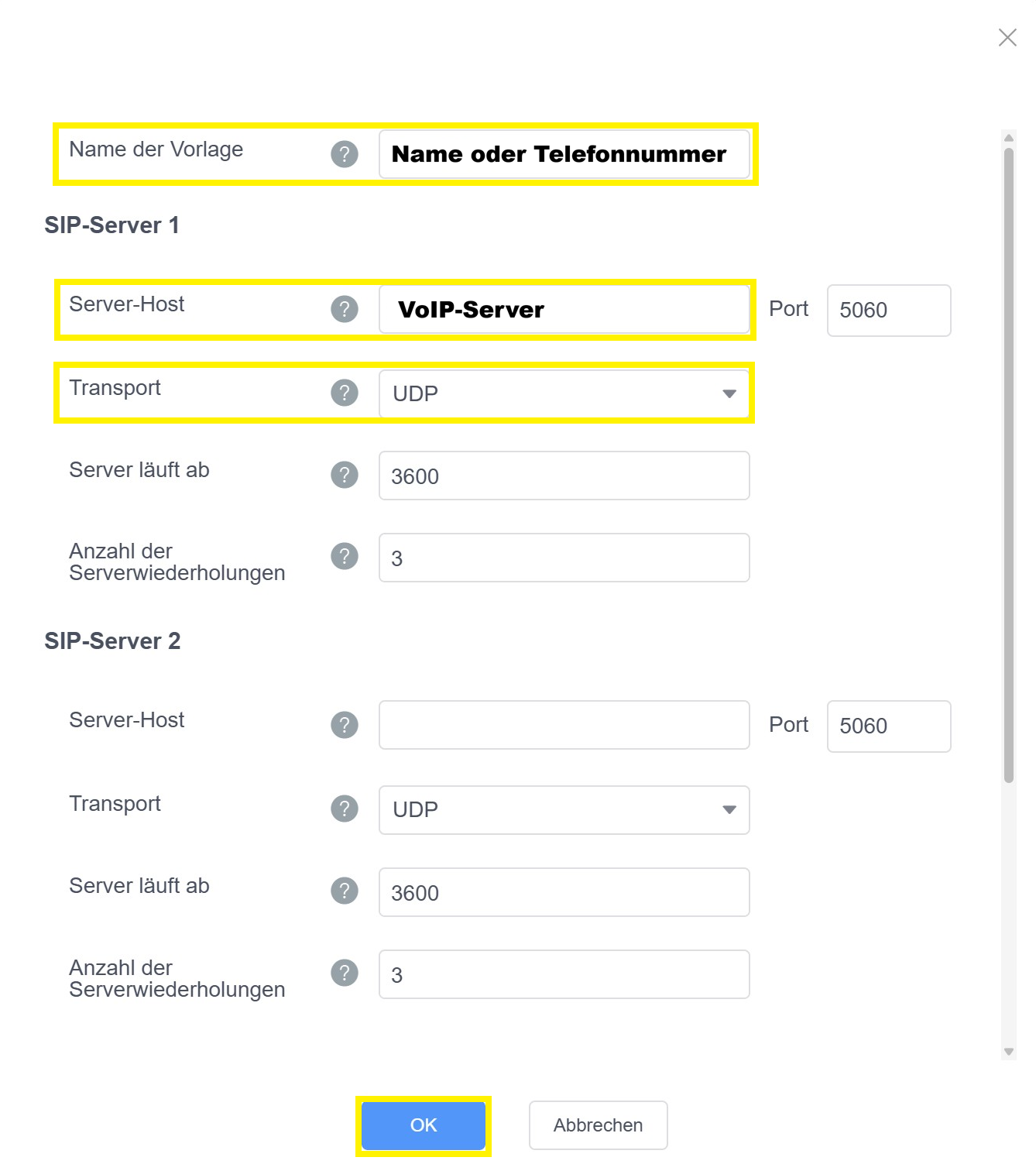 6. Betiteln Sie nun die Vorlage mit einem Namen oder einer Telefonnummer und tragen Sie bei Server-Host den VoIP-Server Ihrer Nebenstelle ein sowie unter Transport wählen Sie UDP. Bestätigen Sie Ihre Eingabe mit dem Button OK.