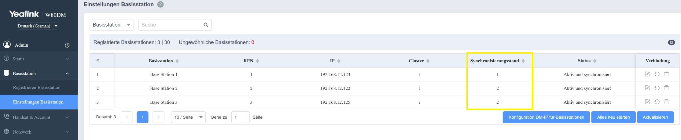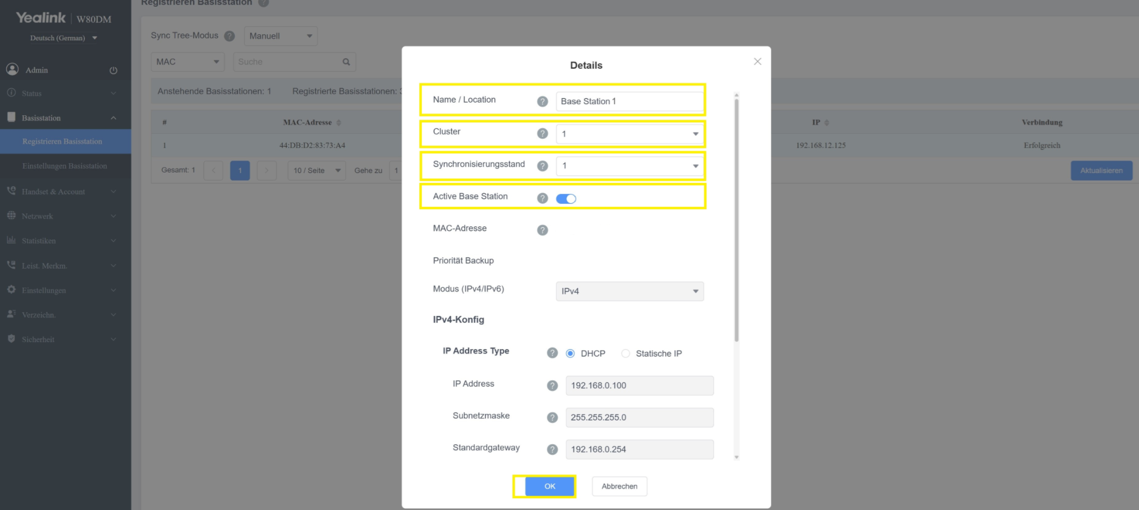 Wichtig: Jede Yealink W80B erhält eine interne IP-Adresse. Wenn Sie die Konfiguration in einem anderen Netz machen, muss nach der Installation die interne IP-Adresse überprüft werden. Falls diese nicht angepasst wird, muss diese manuell angepasst werden.