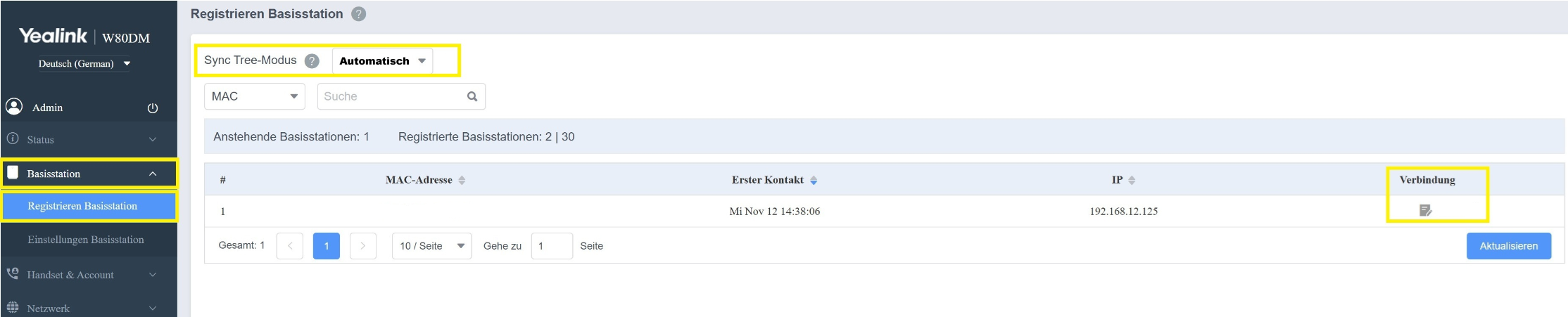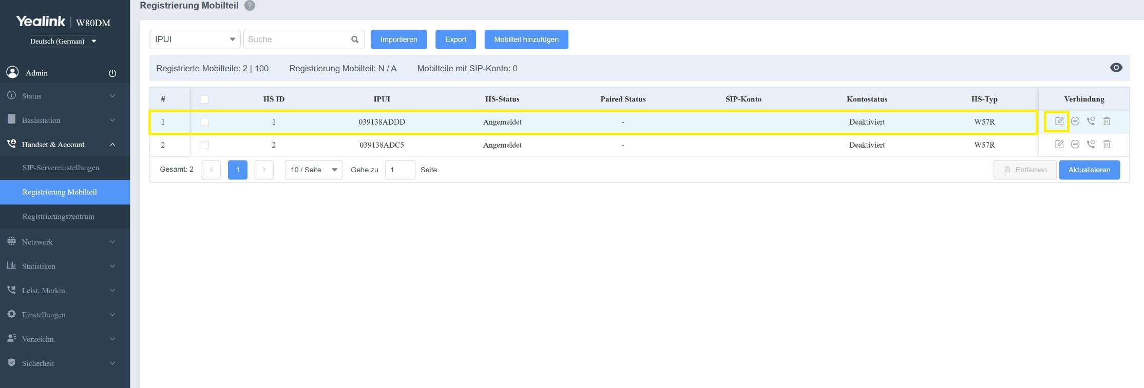 11. Sobald das Mobilteil verbunden wurde, erscheint dieser in der Liste. Sie können anschliessend in der Spalte „Verbindung“ auf das Bearbeiten-Icon klicken, damit sich die neue Eingabemaske öffnet.