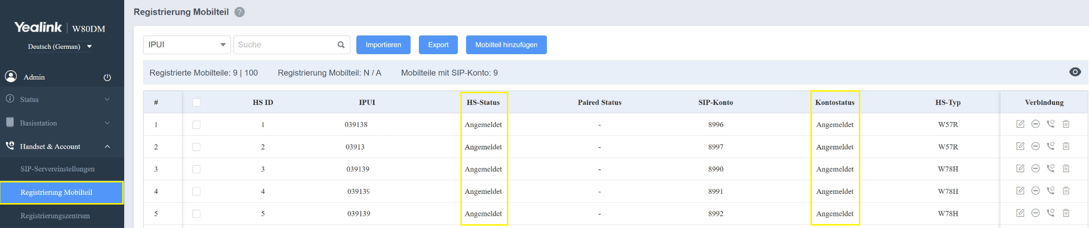 14. Abschliessend ist in der Übersicht des Menüpunkts „Registrierung Mobilteil“ ersichtlich, ob die Mobilteile korrekt konfiguriert wurden und der Kontostatus auf „Angemeldet“ steht.