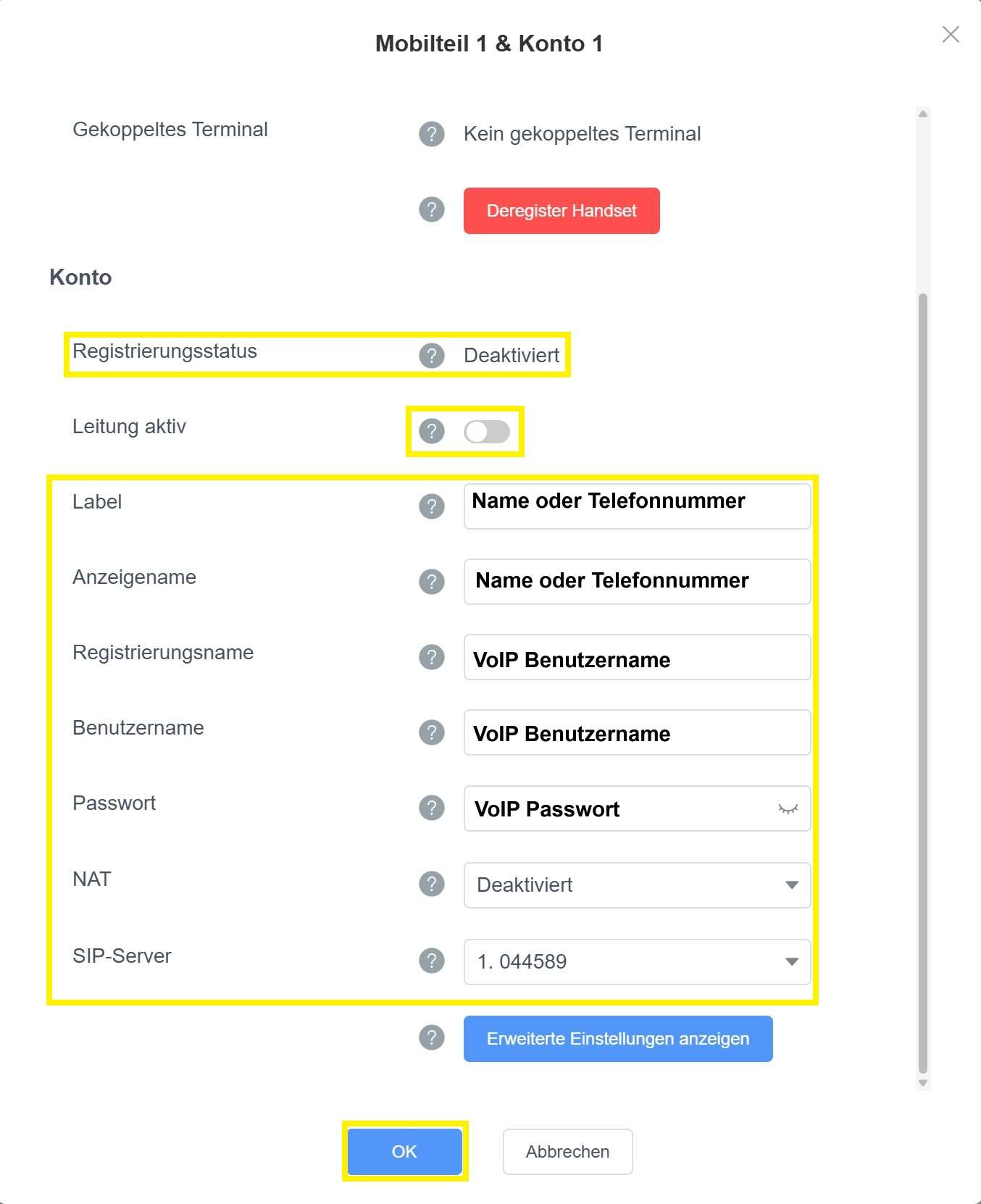 WICHTIG: Die Konfigurationsdaten, also in diesem Fall den VoIP-Server, finden Sie im phonestar* Kundenportal über das Menü --> Telefonanlage --> Endgeräte --> Nebenstelle --> Konfiguration --> Button ANZEIGEN klicken. Weitere Informationen zu Nebenstellen