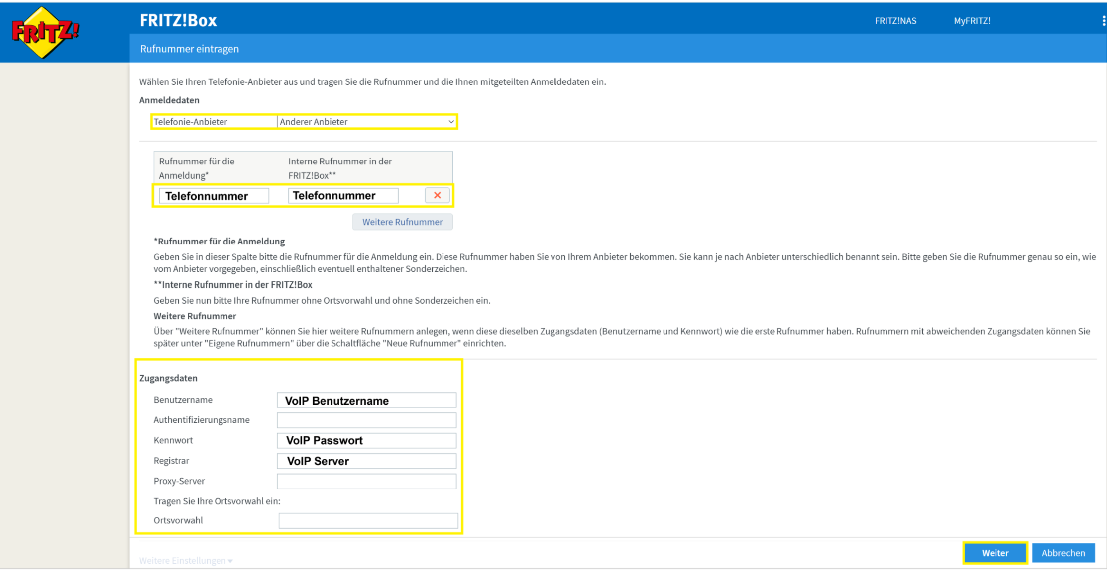 Interne Rufnummer in der FRITZ!Box* = Telefonnummer (Beispiel: 0551234567)