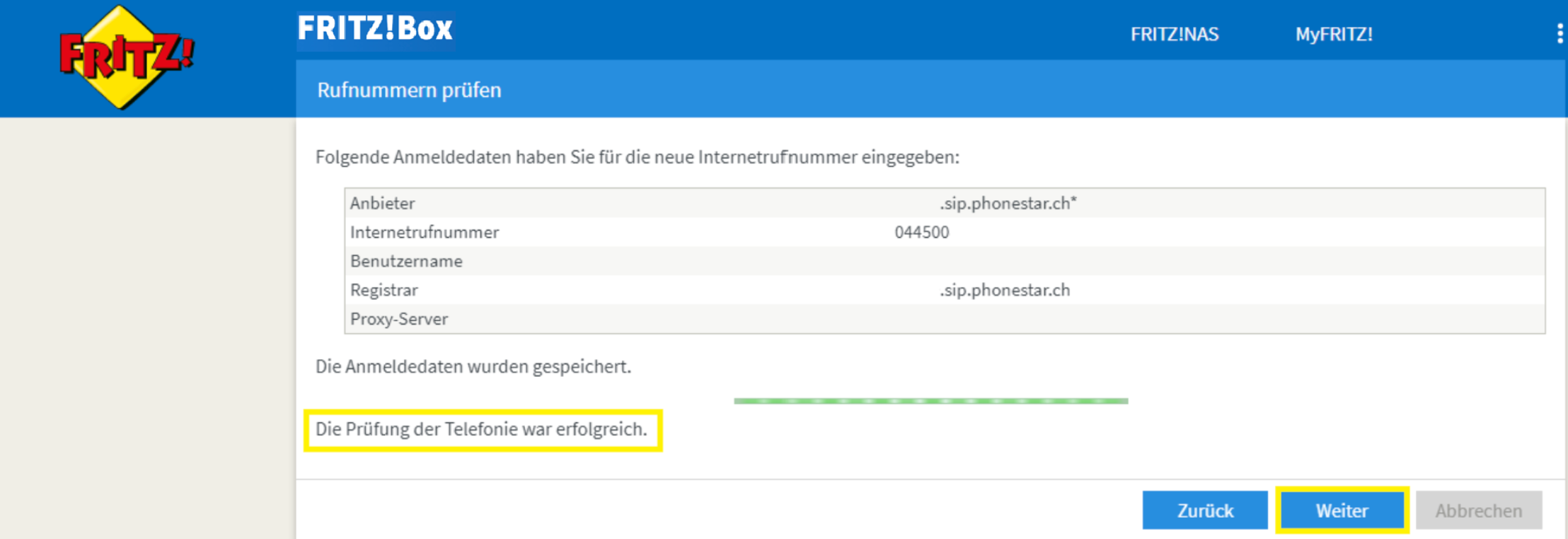 11. Wenn die Überprüfung erfolgreich war, können Sie die Konfiguration der Telefonnummer (Nebenstelle) mit einem Klick auf Weiter abschliessen.