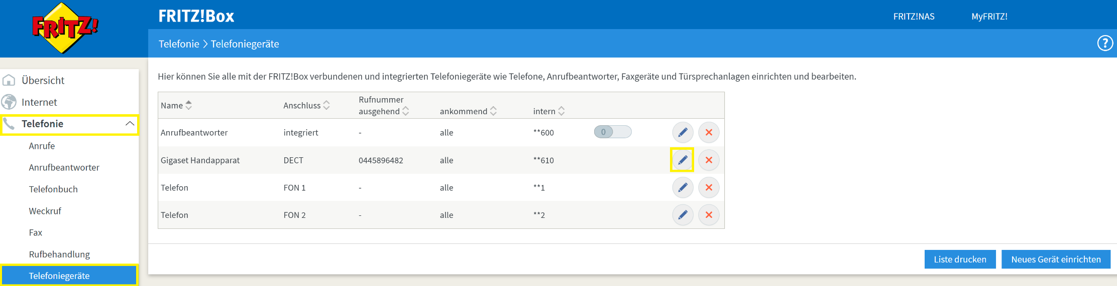 17. Nach erfolgreicher Verbindung kann dem Endgerät die Rufnummer für ein- und ausgehende Anrufe zugewiesen werden. Klicken Sie dazu hinter dem neu verbundenen Endgerät auf den Stift.