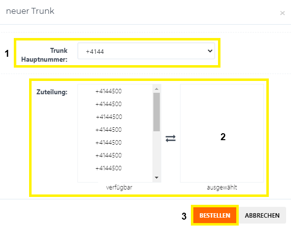 Wählen Sie die Trunk Hauptnummer (1) aus. Als Hauptnummer sollte die Hauptnummer der Firma gewählt werden. Diese Nummer wird unter anderem bei Notrufen für die Standortlokalisierung gesendet. Unter Zuteilung (2) sehen Sie die verfügbaren Nummern, welche mit einem Klick auf die Telefonnummer auf die rechte Seite, ausgewählt, wechseln und somit über den SIP Trunk verwendet werden können. Erstellen Sie den SIP Trunk über den Button BESTELLEN (3).